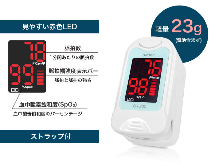 | 測定範囲 | SpO2:35%〜99% 脈拍:30bpm〜250bpm |
